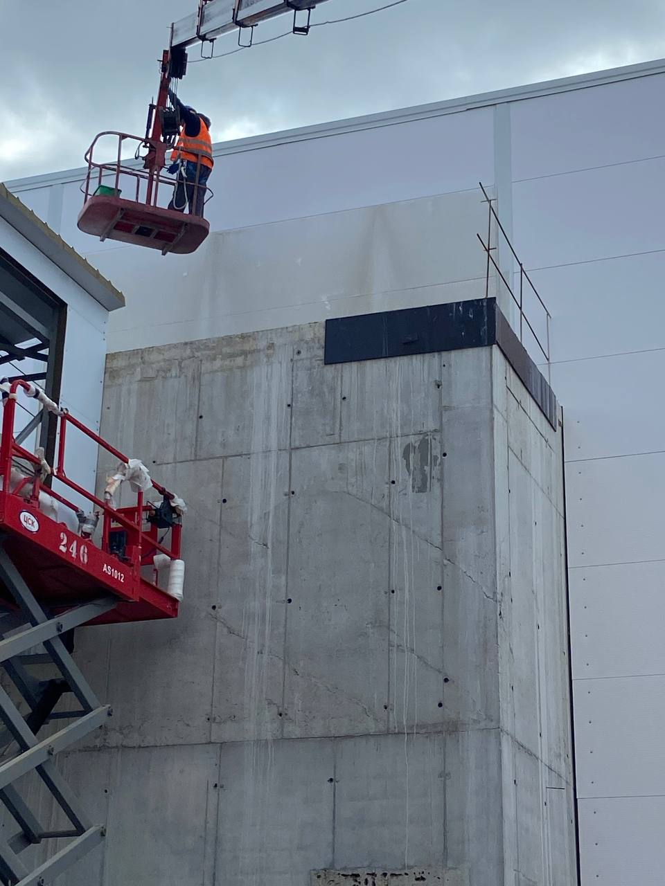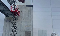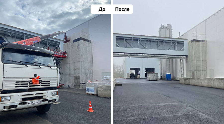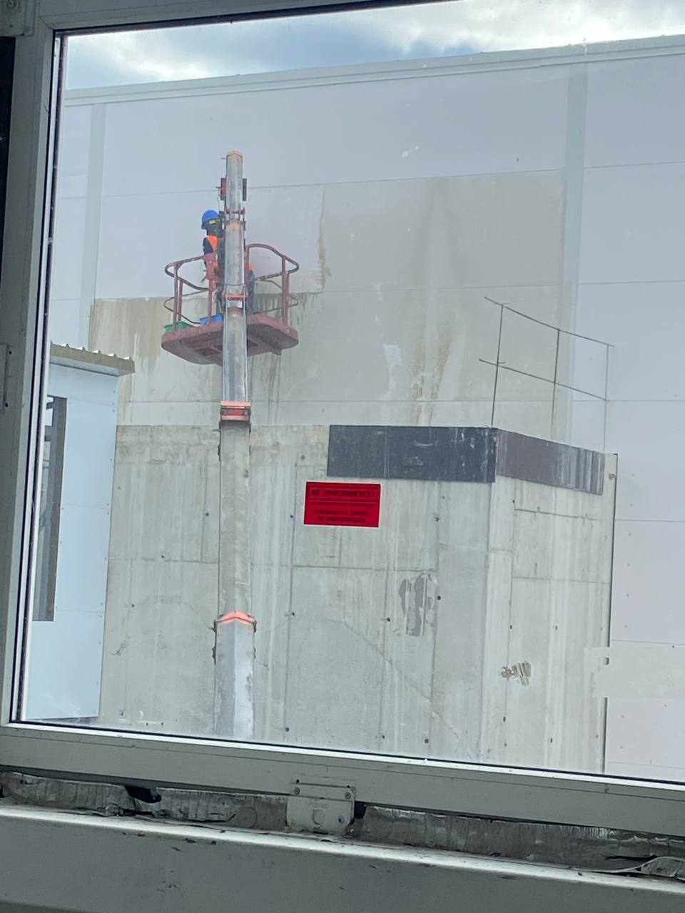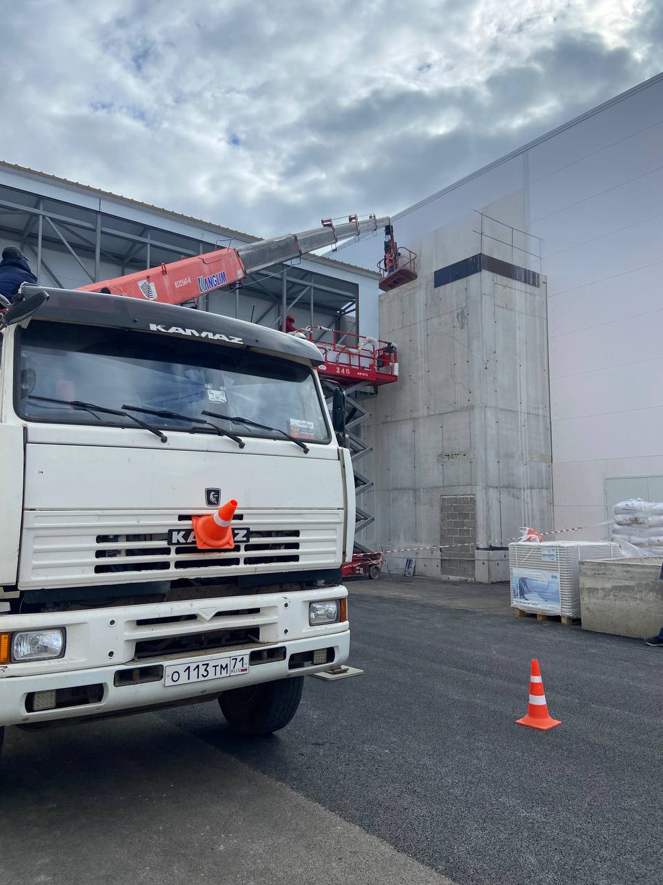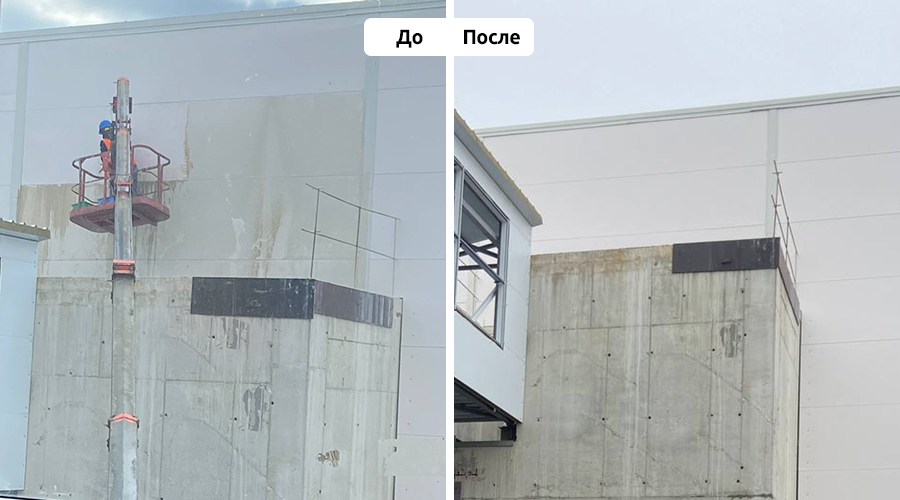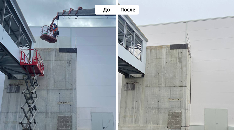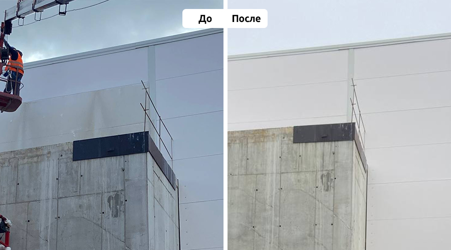 При выполнении работ столкнулись со стойкими послестроительными загрязнениями. Работы выполнялись с применением крана-манипулятора с пристегнутой люлькой.